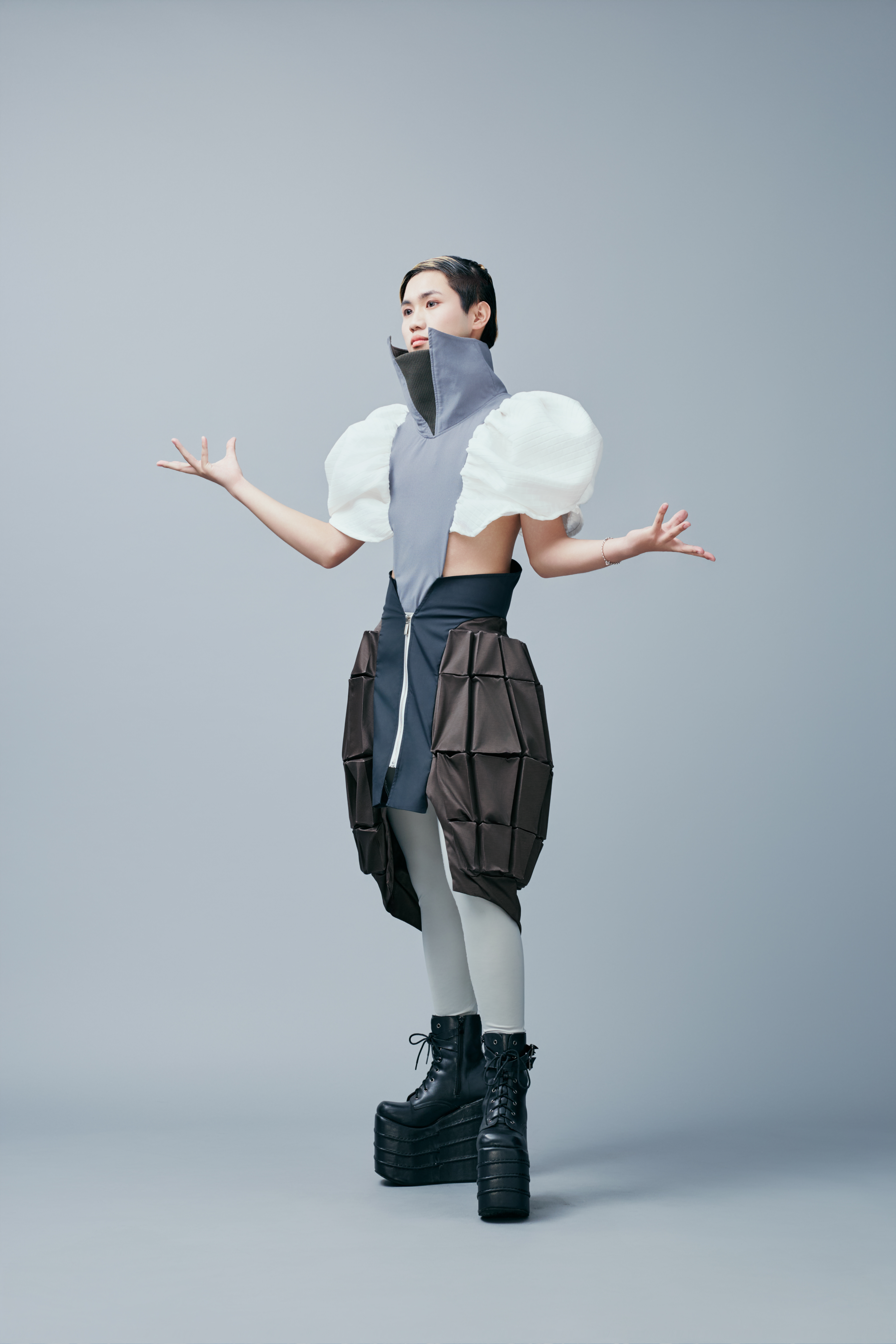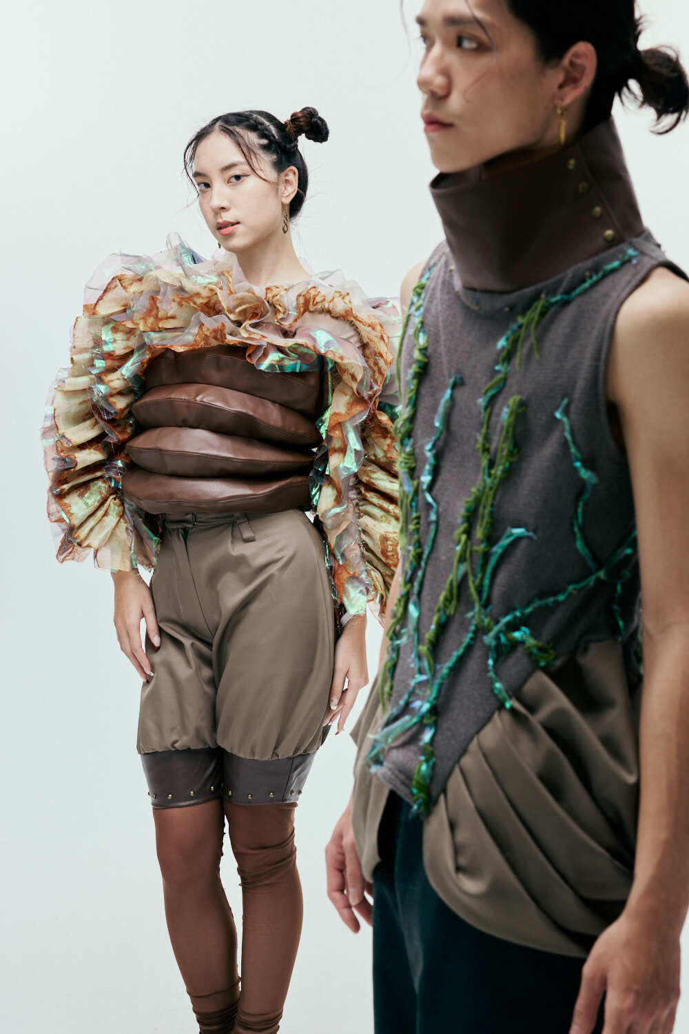 - 以極端氣候導致的末日與生物演變為靈感,融合生物與昆蟲外觀紋理,結合機能性布料,展現具有未來感與反烏托邦風格設計。