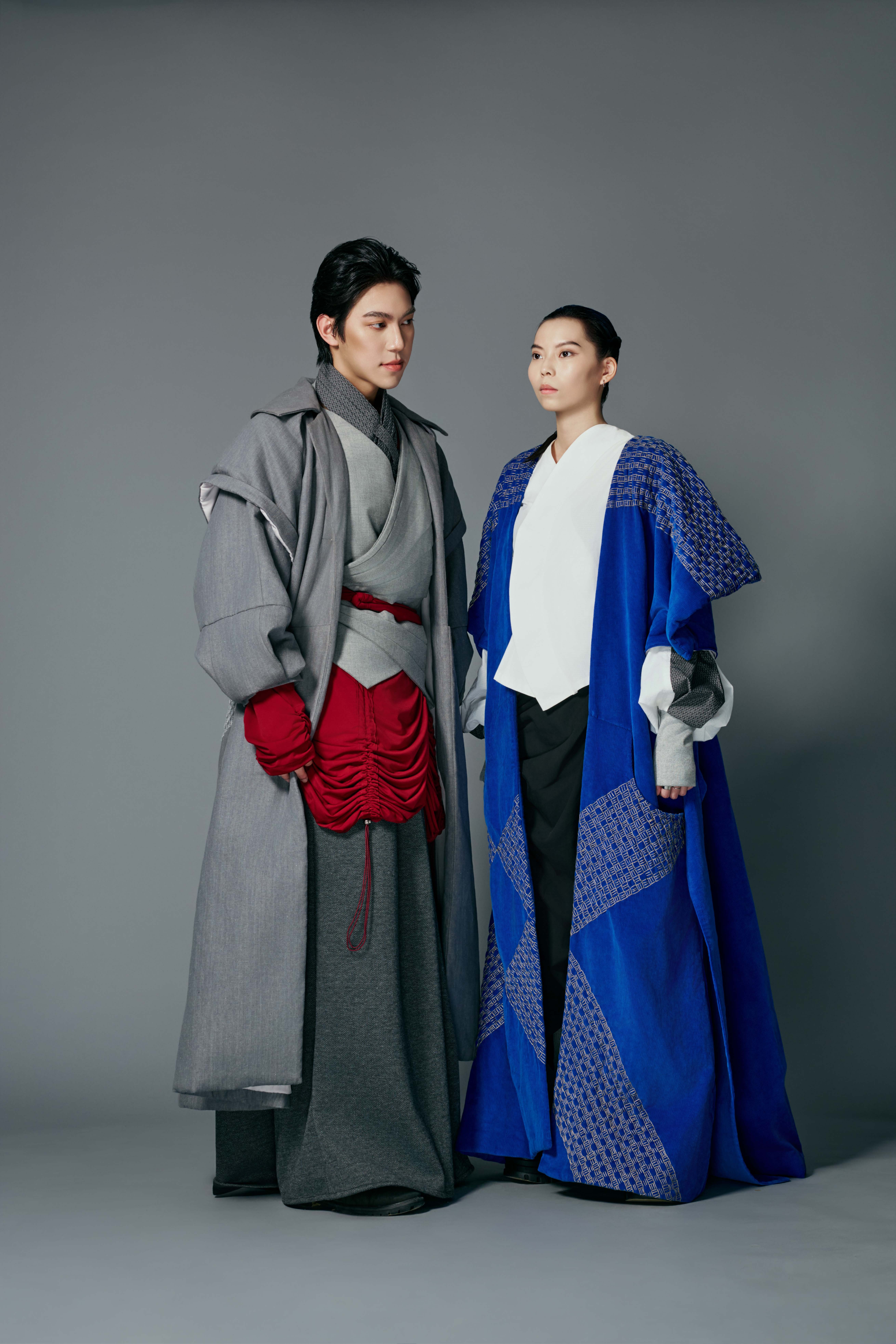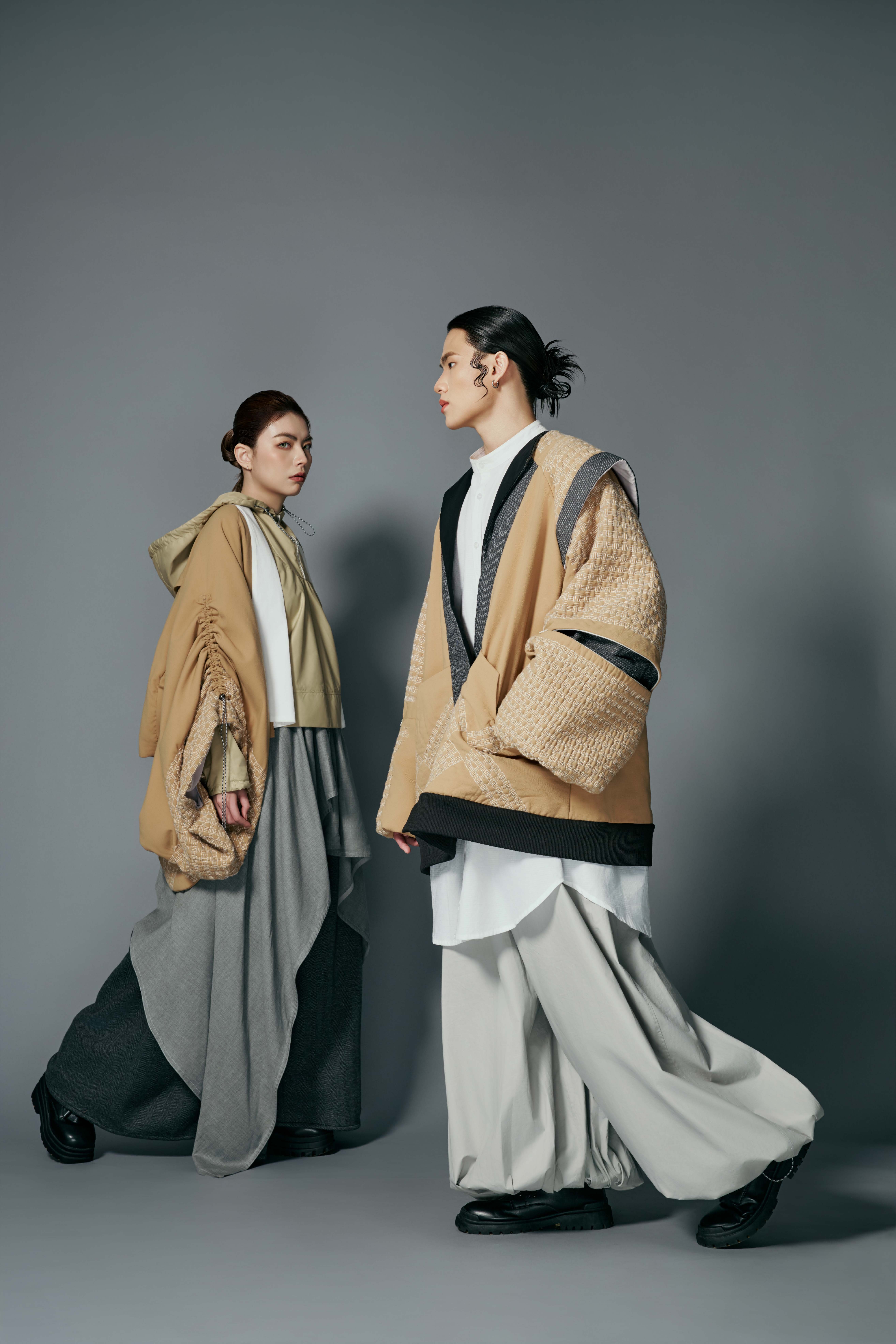 - 以中性風與東京原宿街道發想,紅綠燈、電線交叉重疊與層疊建築轉化為版型呈現疊穿層次,結合傳統刺子繡工法,呈現澀谷大十字路口圖案。